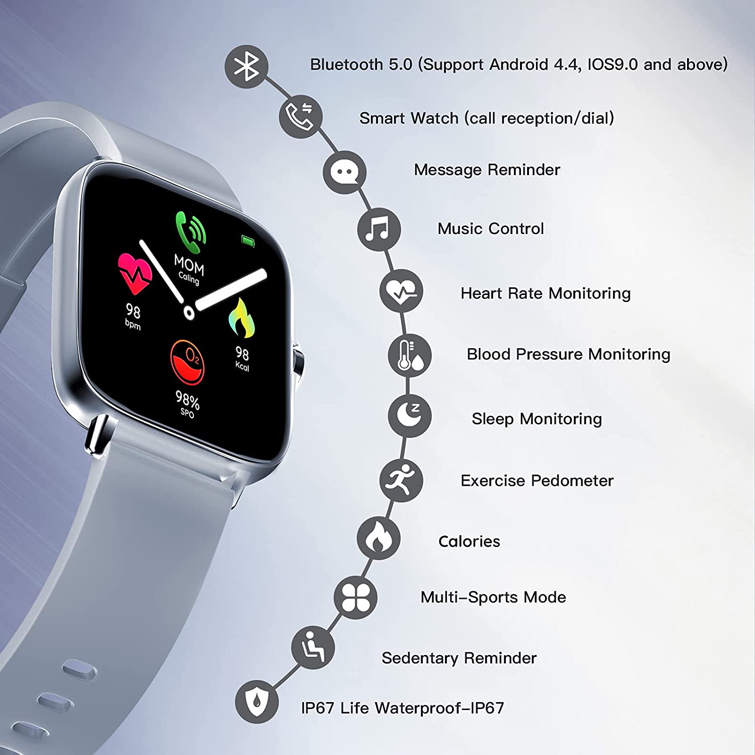 A When the smart watch is synchronized with the smart phone, you can receive and make calls, receive and view SMS and SNS messages, including Facebook, Twitter, WhatsApp, Linkedin, Messenger, etc., email, but you cannot send text messages with the watch.