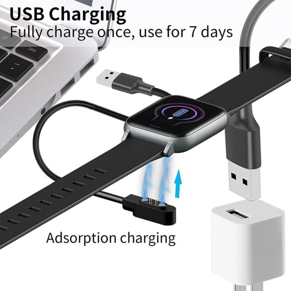 A Thanks for your question! There is a charging cable dedicated to charging the watch. Charging is very convenient and fast. Any device with USB or any mobile phone charger can charge the watch. Take out the charger and touch the bottom of the watch to the charger, it will automatically be attracted by magnetic attraction. A full charge can be used for 5-15 days. If you have any questions, please go to Your Orders, find the order ID in the list, and click Contact with us.I am very happy to answer all your questions and hope you will have a pleasant shopping experience with us!