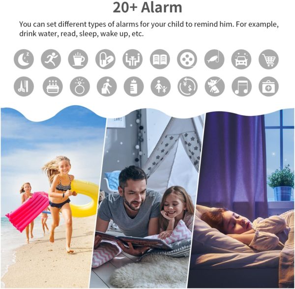A The kids fitness tracker has 20 different alarm clock icons, you can choose the right one to remind him to drink water (need to set on the APP)